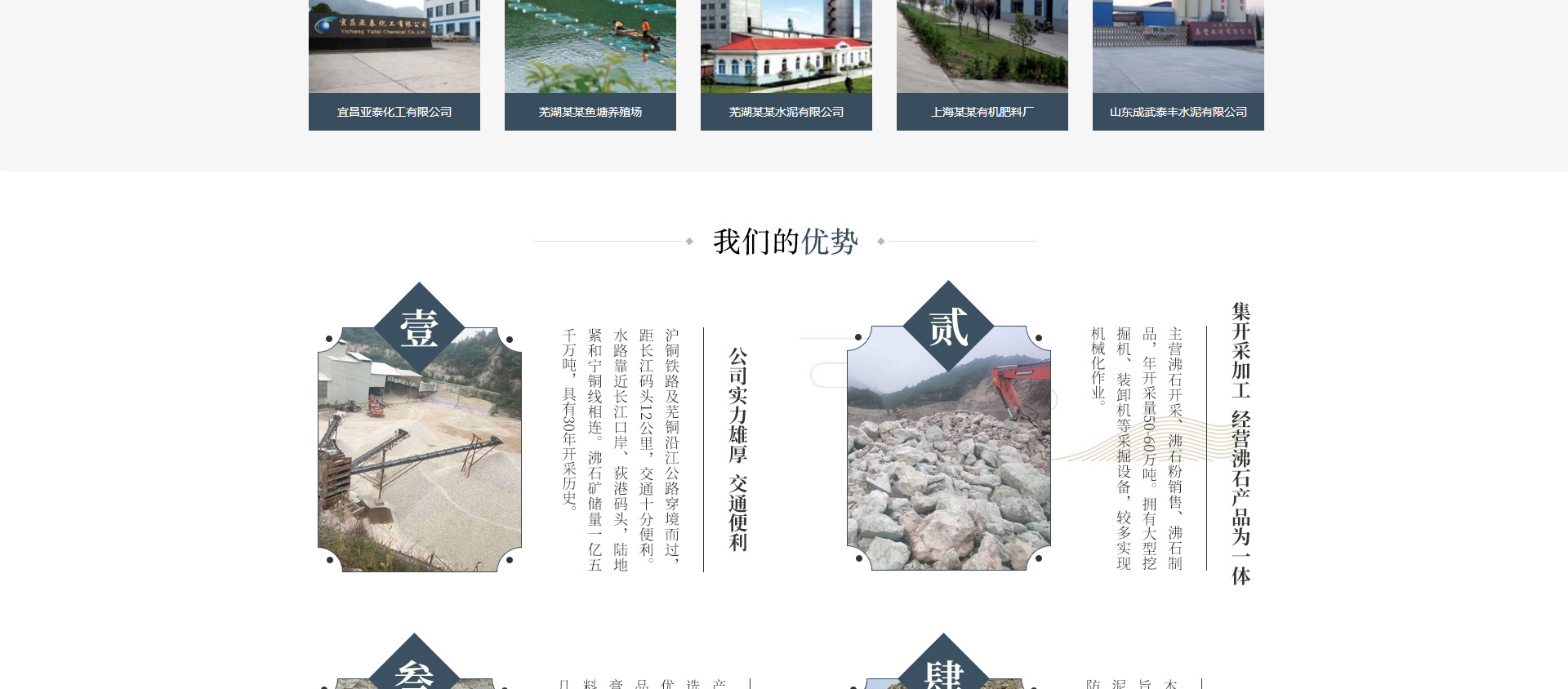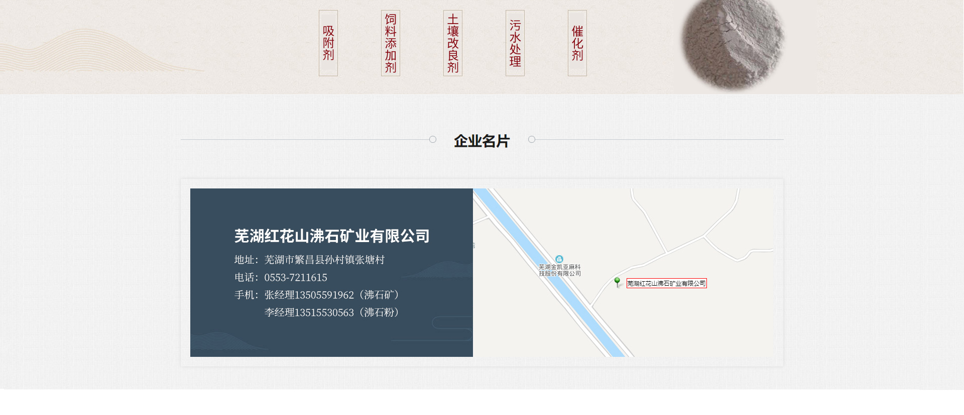 蕪湖紅花山沸石礦業有限公司距繁昌縣約18公里,有公路直達礦區,距滬銅鐵路線的繁昌站、楓香墩站約20公里,礦區西側的赤沙河道直通荻港至長江,水路交通地理位置好。沸石是硅氧、鋁氧四面體構成的架狀硅酸鹽,有較大的比表面積和孔體體積。我礦沸石經321、803地質隊勘探儲量約一億噸以上,主要為絲光沸石(Ca、Na、K2)【ALSi2O2】27H2O,此外還含有石英、蒙脫石等,經合肥工業大學、蕪湖市科委、華東冶金地質礦產研究所、南京地礦研究院等單位測試測定沸石含為55%—68%。